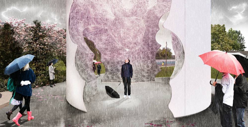 The Thunderhead monument will dramatically rise at the centre of the property. First appearing as a monolithic cylinder, but as one approaches, the towering shape will break down to reveal glimpses into a striking interior volume. The form feels as though a concrete cylinder was cast around a rising and billowing thundercloud, and when the mold was peeled away, it revealed a negative space that reads as though the dynamic, fluid, and ethereal nature of the cloud has been captured and given permanence. Symbolically harnessing the power of a thundercloud that becomes stronger as it grows, fills visitors with a feeling of hope and empowerment. The cloud breaking through the rigid boundaries of the traditional cylindrical form represents the strength of activism and the power of community. The billowing interior space, covered in thousands of glass mosaic tiles, will reflect the many faces of a wonderfully diverse community, the sparkling light, a joyful reference to a disco ball.