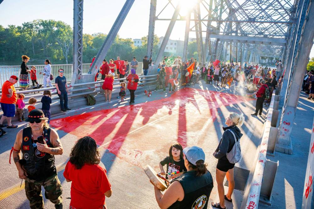Family members held a prayer and offered tobacco to the water before painting a red dress symbol with the words “Justice for Doris” across both lanes of the bridge.