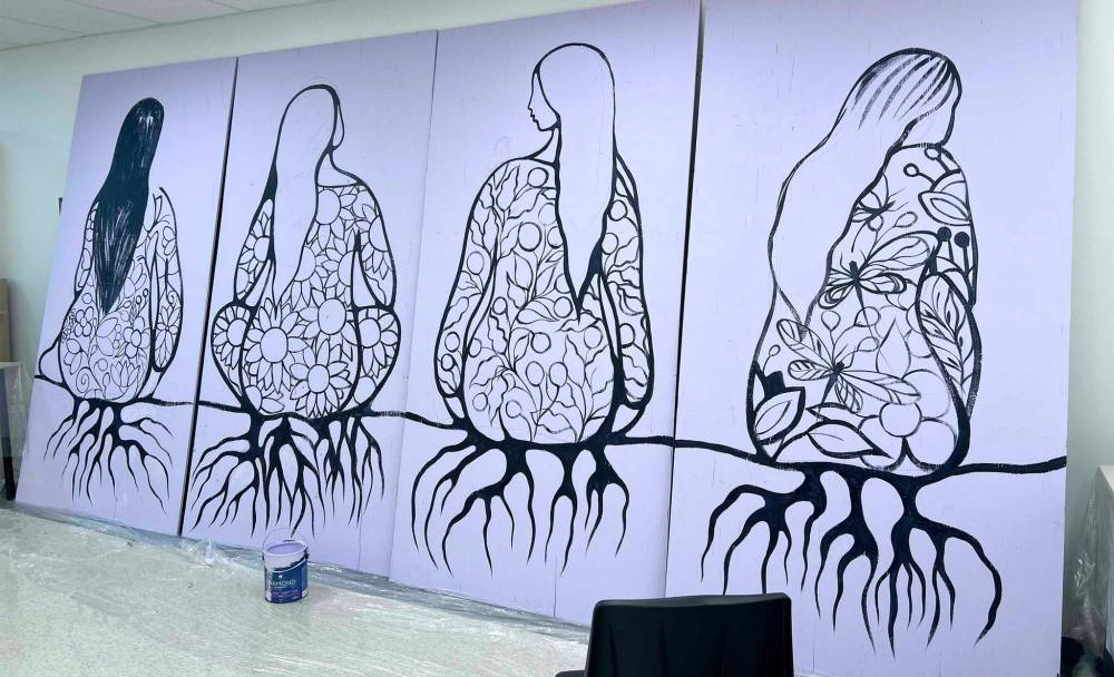 Jackie Traverse, with the help of students at Mary Duncan School, will be working on a mural. The mural features four panels, with four women seated, roots growing from them into the ground.
