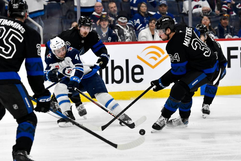 THE CANADIAN PRESS/Fred Greenslade Toronto Maple Leafs’ Austin Matthews and Winnipeg Jets’ Neal Pionk fight for the puck during the second period.