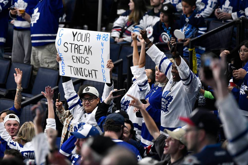 THE CANADIAN PRESS/Fred Greenslade Toronto Maple Leafs fans celebrate the win over the Winnipeg Jets in Winnipeg on Monday.