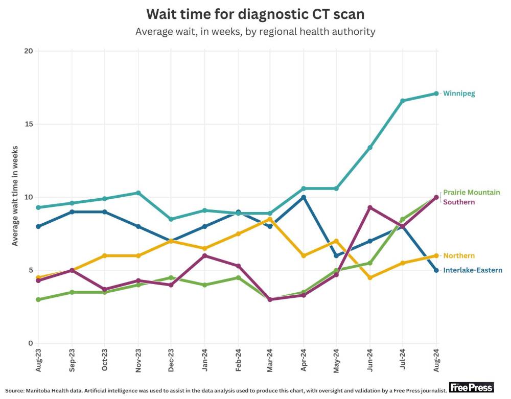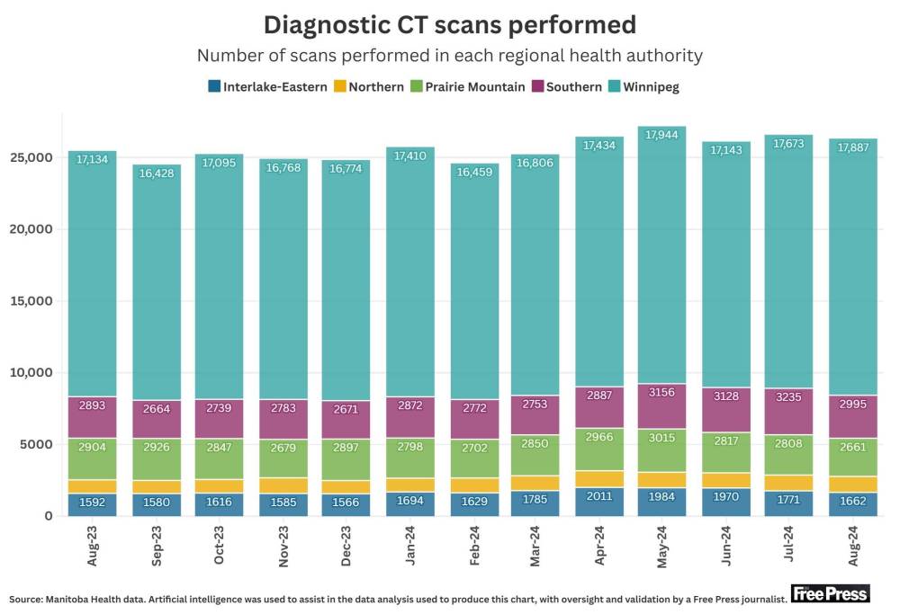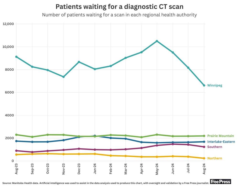 In August, 11,961 Manitobans were waiting for a CT scan, compared to 14,621 who were waiting in August 2023.