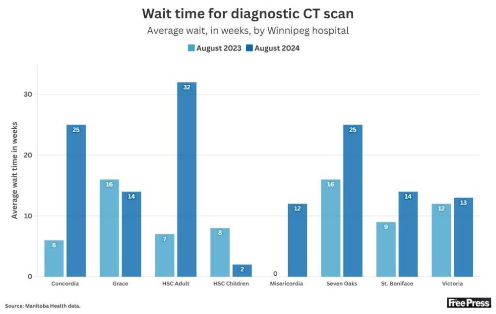 At Seven Oaks Hospital, the wait for a CT scan surged to 25 weeks in August from 16 weeks a year earlier, according to Manitoba Health numbers. At Concordia, the wait for a scan nearly quadrupled from six weeks to 25 weeks in the same period. And the wait time at Health Sciences Centre increased to 32 weeks from seven weeks in August 2023.