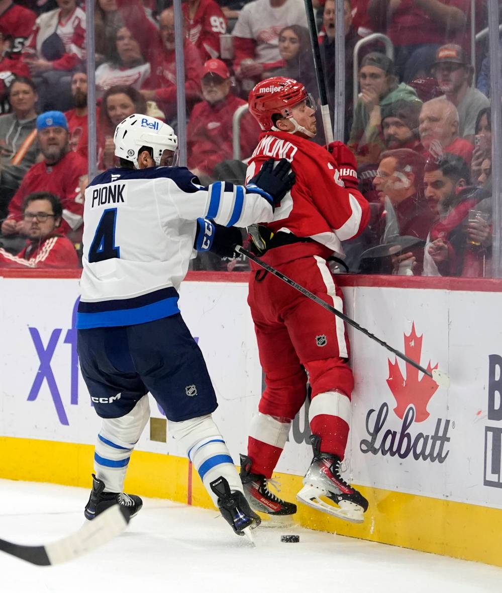 Carlos Osorio / The Associated Press Winnipeg Jets defenceman Neal Pionk checks Detroit Red Wings left wing Lucas Raymond during the second period.