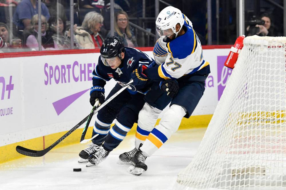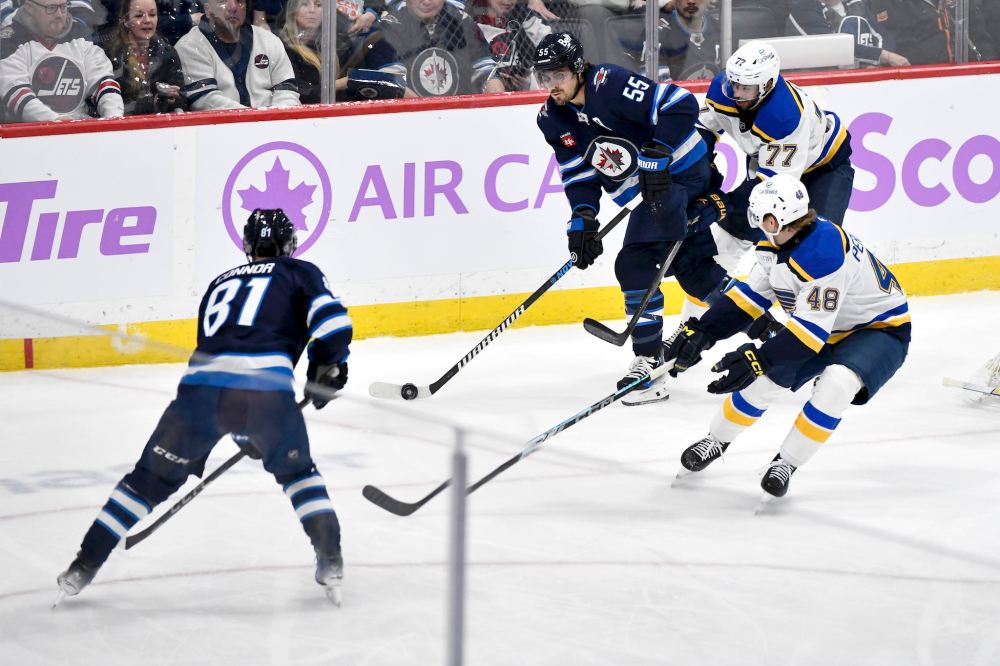 Fred Greenslade / THE CANADIAN PRESS Winnipeg Jets' Mark Scheifele passes to Kyle Connor as St. Louis Blues' Scott Perunovich and Pierre-Olivier Joseph defend during the first period
