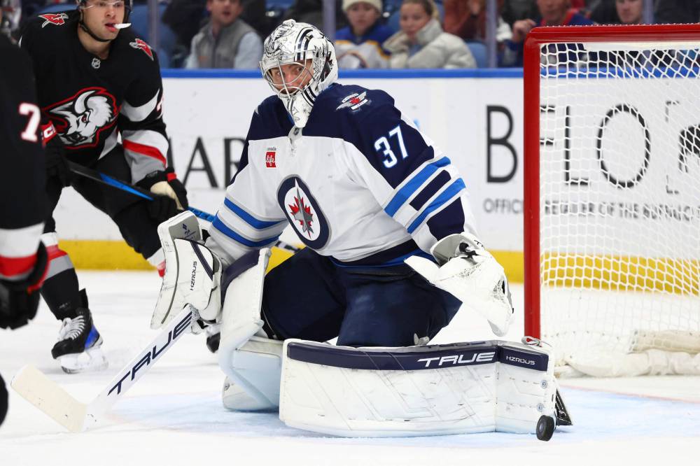 Jeffrey T. Barnes / The Associated Press Winnipeg Jets goaltender Connor Hellebuyck makes one of his 28 saves of the game during the first period.