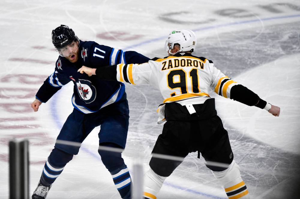 FRED GREENSLADE / THE CANADIAN PRESS Boston Bruins’ Nikita Zadorov fights with Winnipeg Jets’ Adam Lowry during the third period.