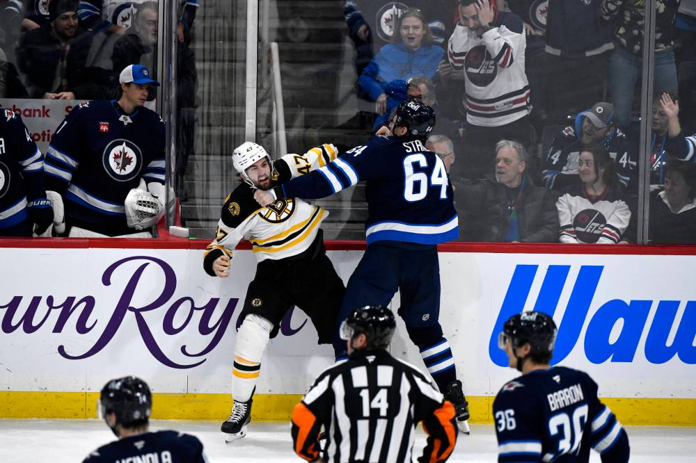 FRED GREENSLADE / THE CANADIAN PRESS Boston Bruins’ Mark Kastelic fights with Winnipeg Jets’ Logan Stanley during the third period.