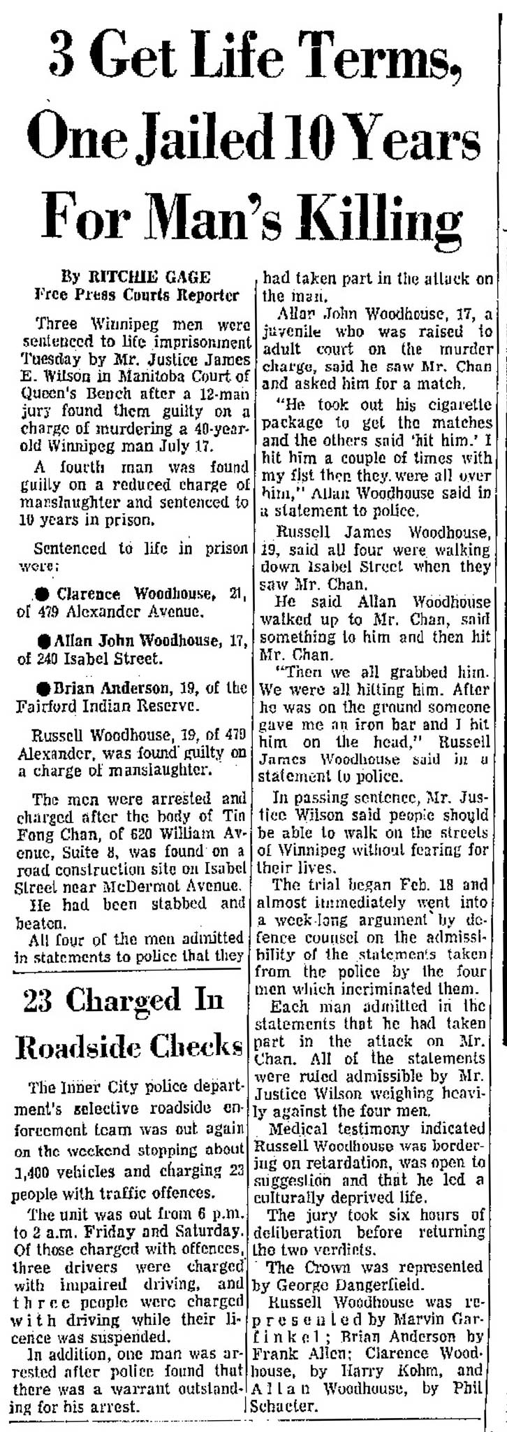 A clipping from the Winnipeg Free Press on March 6, 1974 about the sentencing of Clarence Woodhouse, John Woodhouse, Brian Anderson and Russell Woodhouse.Court heard the men were beaten by police and forced to sign false confessions written in English, despite none of them being fluent in the language. Clarence Woodhouse required the assistance of a Saulteaux interpreter to testify.