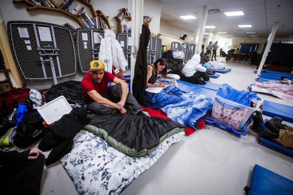 People settle in at Oak Table/Just A Warm Sleep overnight shelter in Osbourne Village. (John Woods / Free Press)