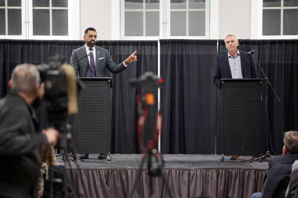 BRANDON — Two competing visions for the future of Manitoba’s Official Opposition party clashed hard Wednesday evening as Progressive Conservative leadership candidates Wally Daudrich and Obby Khan traded insults during the party’s first leadership debate in front of a crowd of nearly 100 strong.