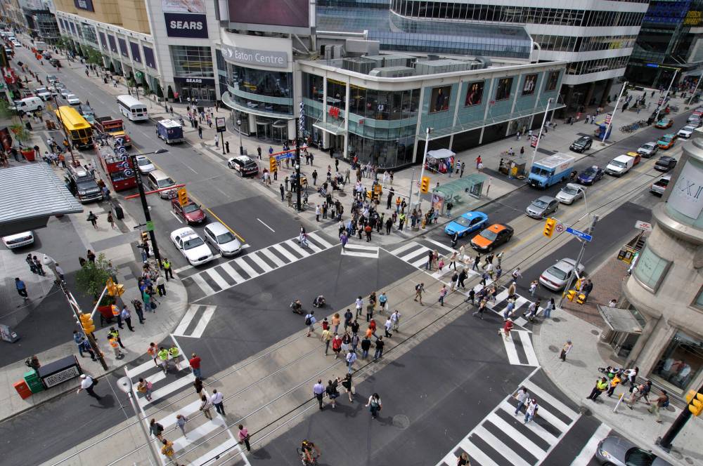 Toronto’s first pedestrian scramble intersection was unveiled at one of the city’s busiest intersections in 2008. (Patrick Dell / The Canadian Press files)