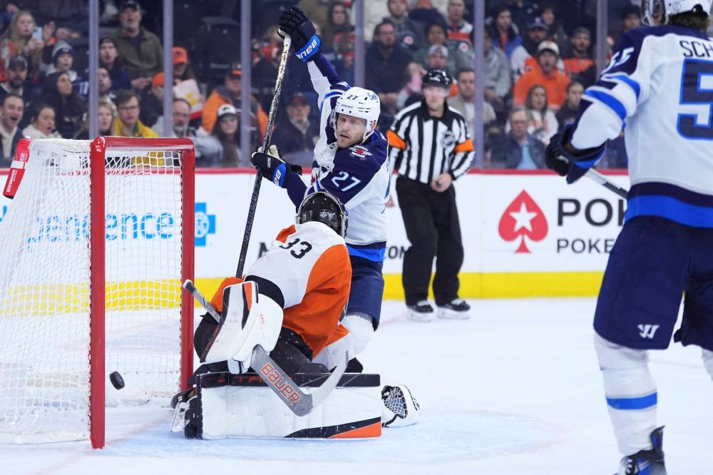 Nikolaj Ehlers slams a first-period power-play goal past Flyers goalie Samuel Ersson Thursday night in Philadelphia. The goal, Ehlers’ 20th of the season, was the game-winner.