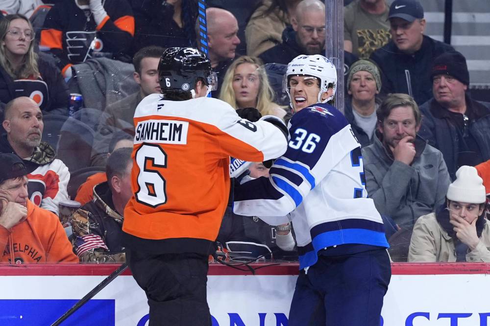 Winnipeg Jets’ Morgan Barron and Philadelphia Flyers’ Travis Sanheim collide during the third period.