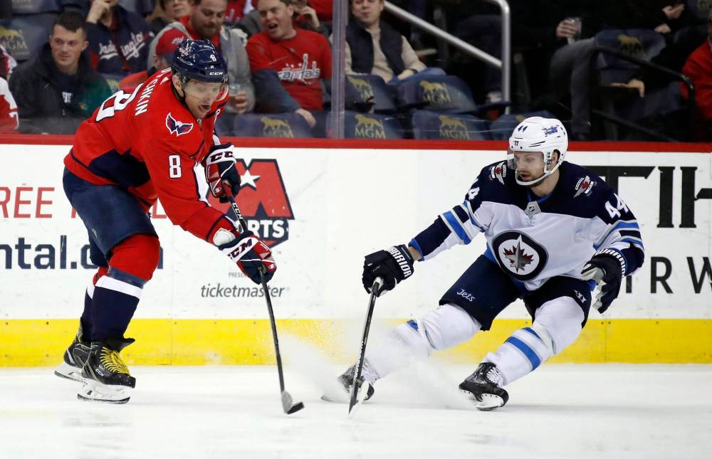 Winnipeg Jets defenceman Josh Morrissey (right) tries to block Washington Capitals’ Alex Ovechkin. The Jets enter Tuesday’s contest two points behind the Capitals in the chase for the Presidents’ Trophy.