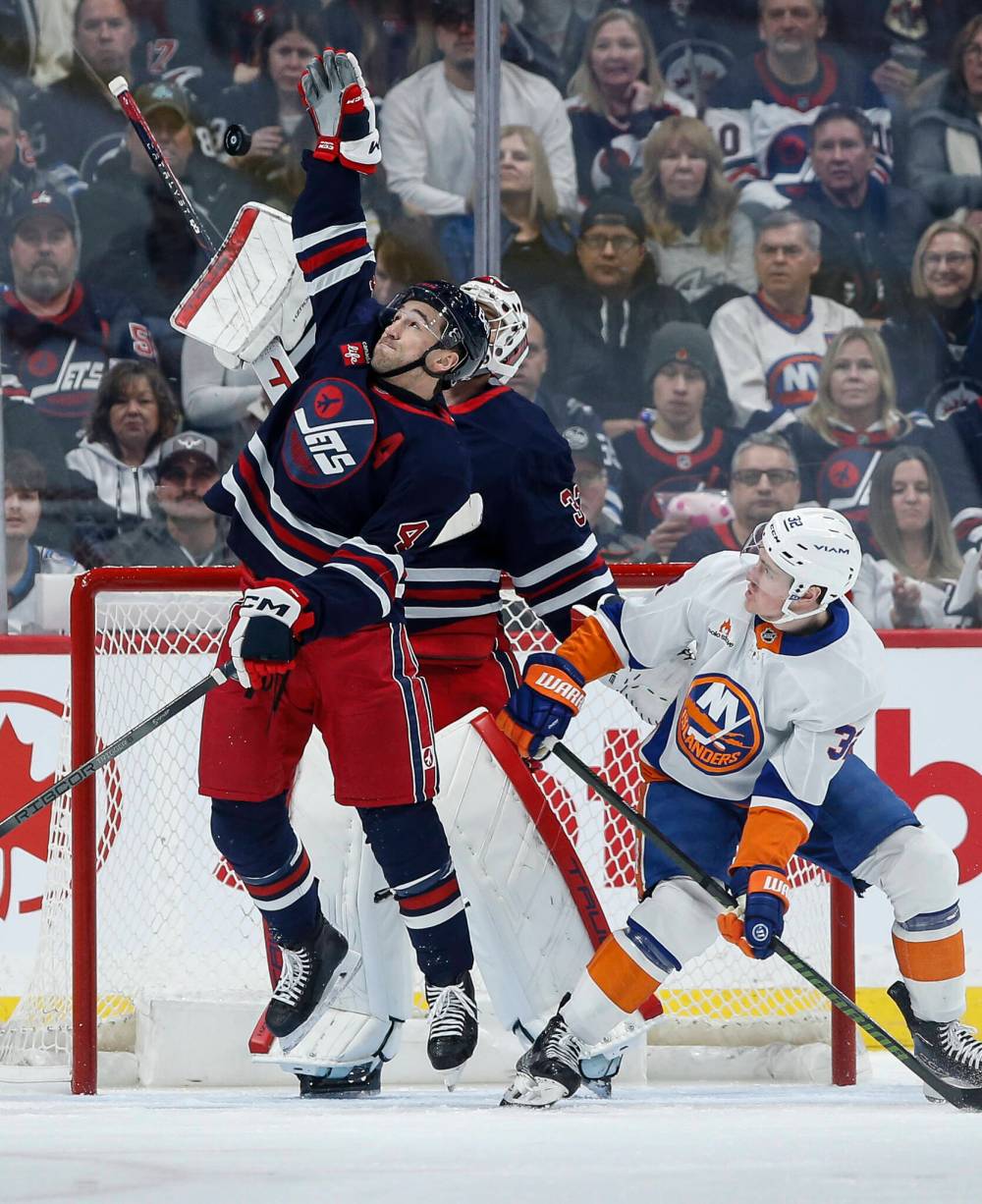 Winnipeg Jets’ Neal Pionk (4) reaches up to clear the puck as he defends against New York Islanders’ Kyle MacLean (32) during second period NHL action in Winnipeg February 7. (John Woods / The Canadian Press files)