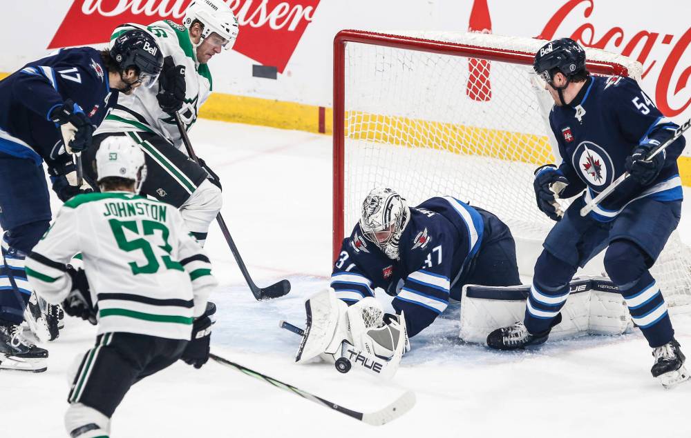 Winnipeg Jets goaltender Connor Hellebuyck (37) saves the shot from Dallas Stars’ Wyatt Johnston (53) during first period NHL action on March 14. (John Woods / The Canadian Press files)