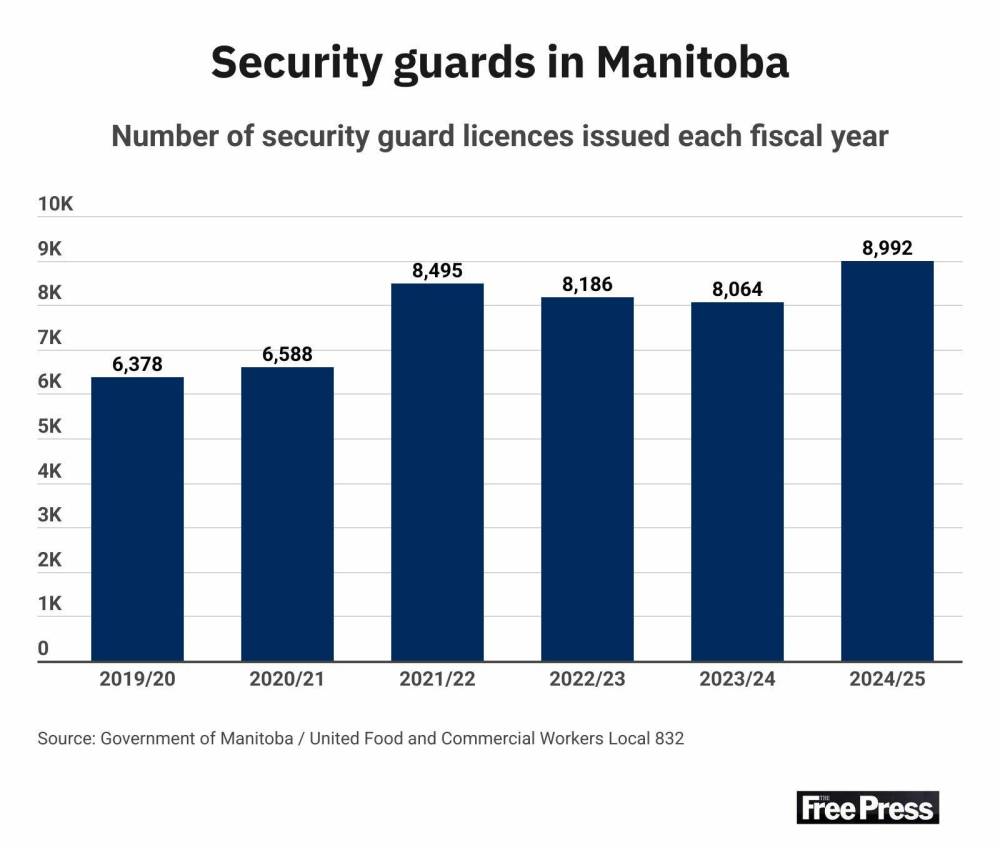 Data shows the number of private security guards licensed by the provincial government has jumped in the last five years.