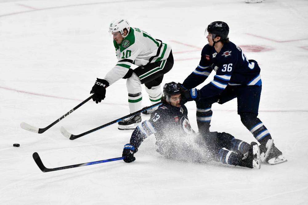 Winnipeg Jets’ Adam Lowry and Neal Pionk collide with Dallas Stars’ Roope Hintz in the first period.