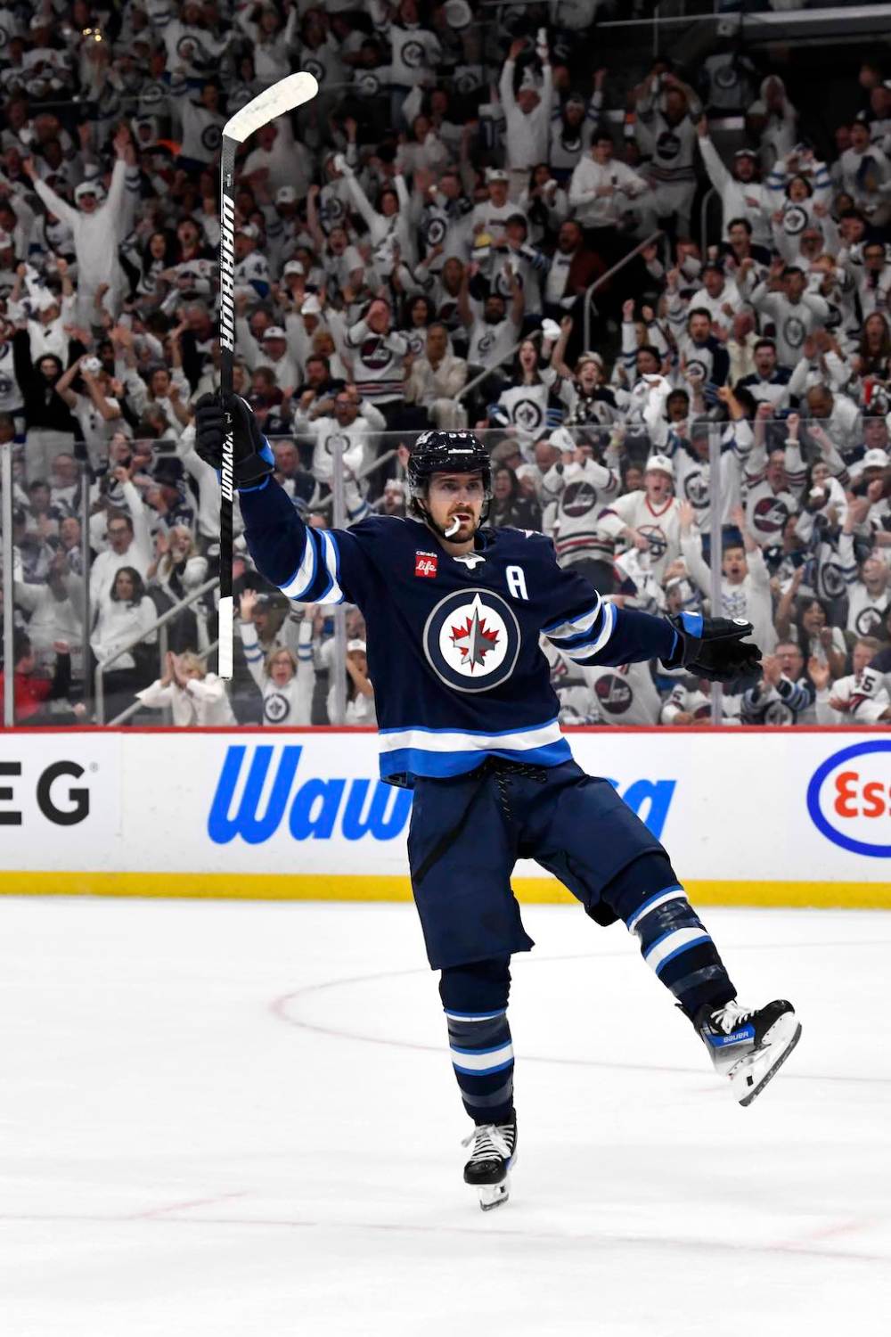 Winnipeg Jets' Mark Scheifele celebrates his second-period goal against the Dallas Stars.