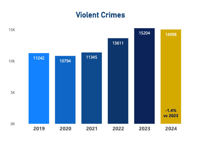 Total reports of violent crime: (14,998) decreased by 1.4 per cent from 2023.