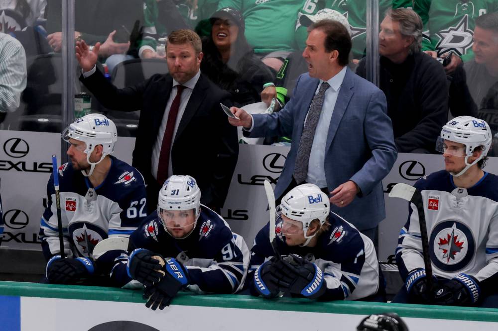 Winnipeg Jets head coach Scott Arniel, back right, yells at his players on the ice in the third period of Game 4 of their second-round NHL hockey playoff series in Dallas, Tuesday.