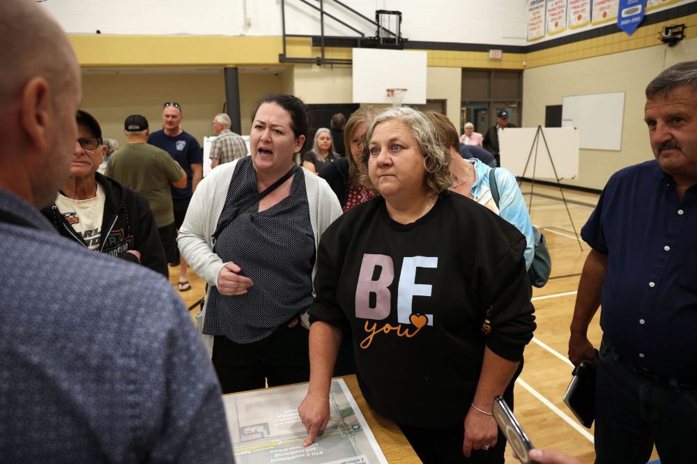 Jordan Dickson, left, and Debra Steen, organizers of the local opposition to the proposed RCUT modification to the Trans Canada Highway, voice their opposition at the community engagement meeting in Carberry, Wednesday evening.