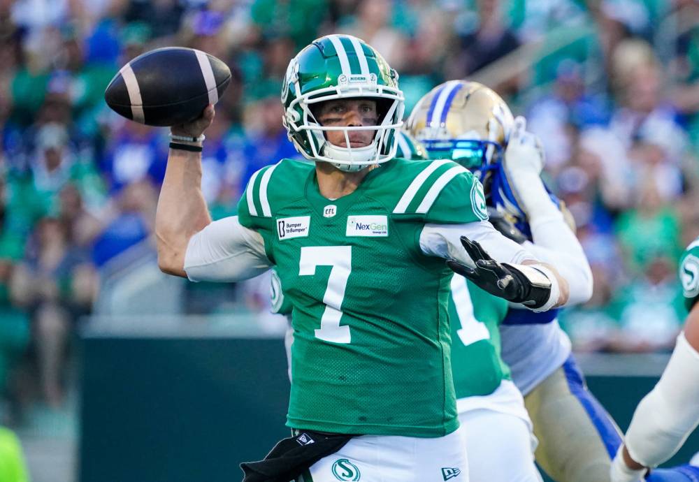 Winnipeg Blue Bombers defensive co-ordinator Jordan Younger praised Saskatchewan Roughriders quarterback Trevor Harris’s (7) high football IQ this week, saying the Riders QB can pick apart a defence.