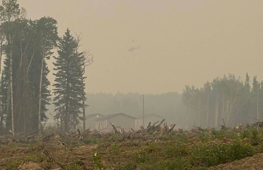 A helicopter fights the fire at Mathias Colomb Cree Nation on May 29.