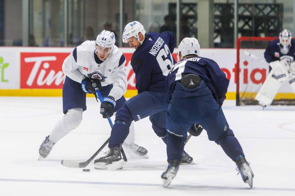 MIKE DEAL / FREE PRESS Winnipeg Jets’ Logan Stanley (64), Nino Niederreiter (62), and Vladislav Namestnikov (7) during training camp at Hockey For All Centre Thursday on Thursday, September 18, 2025.
