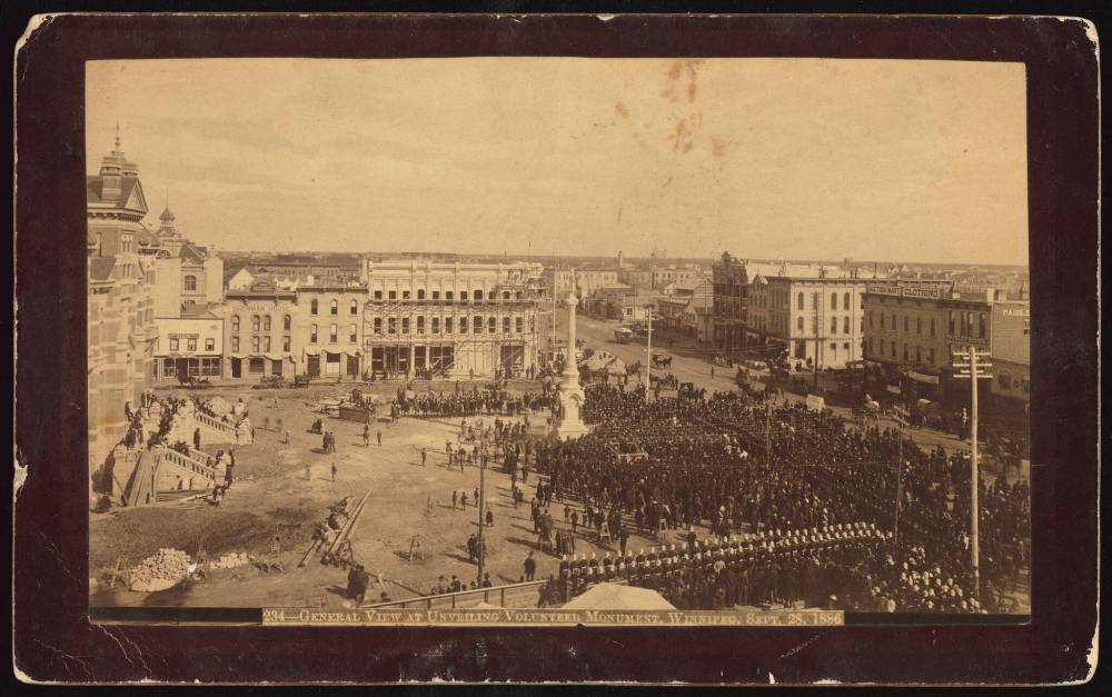 WINNIPEG FREE PRESS ARCHIVES The unveiling of the Volunteer Monument outside city hall on Sept. 28, 1886, drew a sizeable crowd. The monument is now situated just off Main Street between the Manitoba Museum and Centennial Concert Hall.