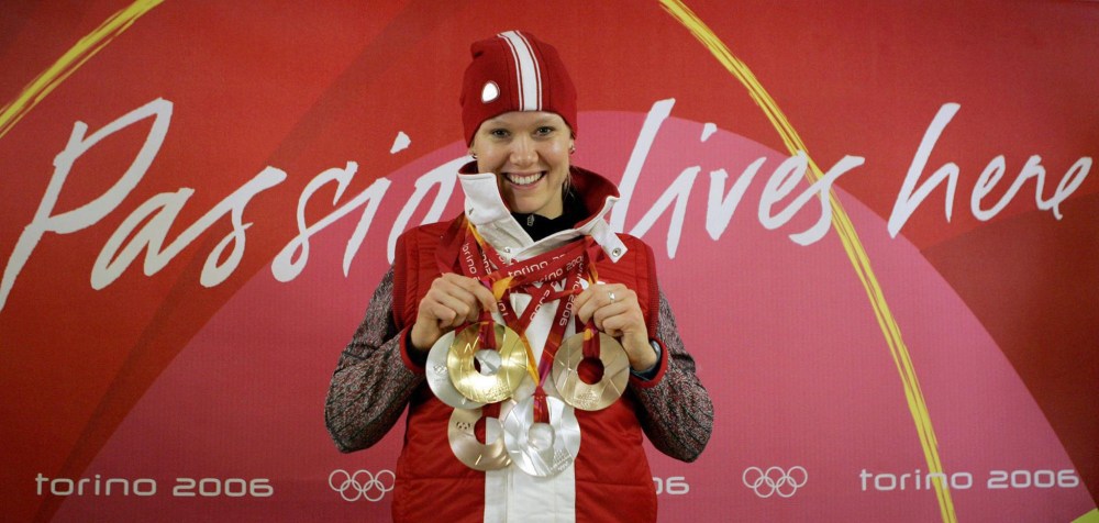 Cindy Klassen poses with her five Olympic medals for speedskating at Oval Lingotto during the 2006 Winter Olympics in Turin, Italy.