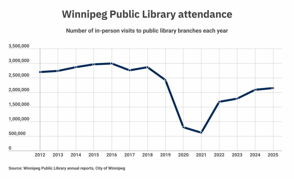 In-person visits to the city’s 20 library branches in 2025 increased 28 per cent from 2022, the first year visits began to rebound after the COVID-19 pandemic, but they have yet to return to the “before” times.