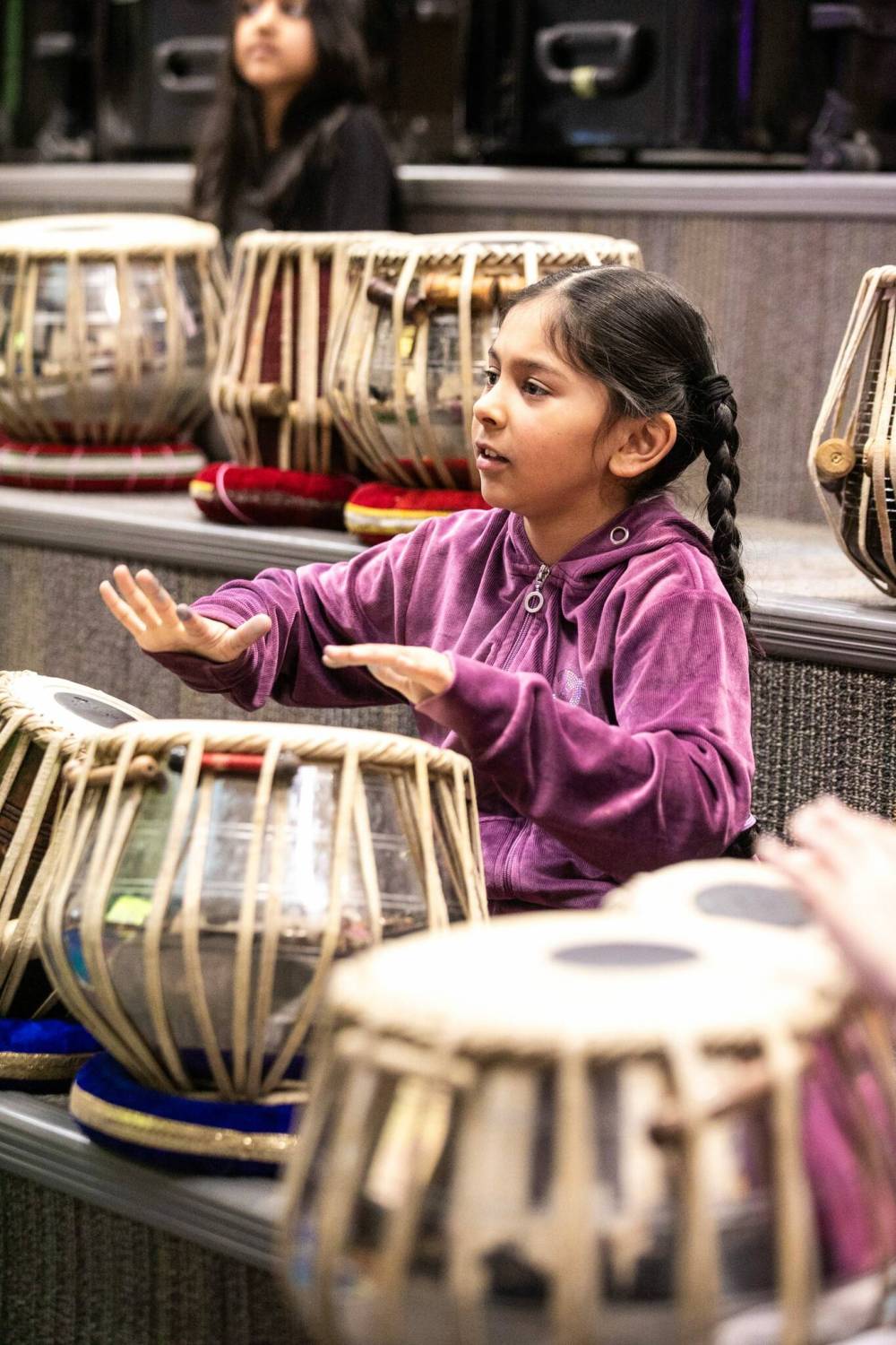 For many young musicians at Arthur E. Wright School, tabla class begins with a bow and tapping their music teacher’s toes.