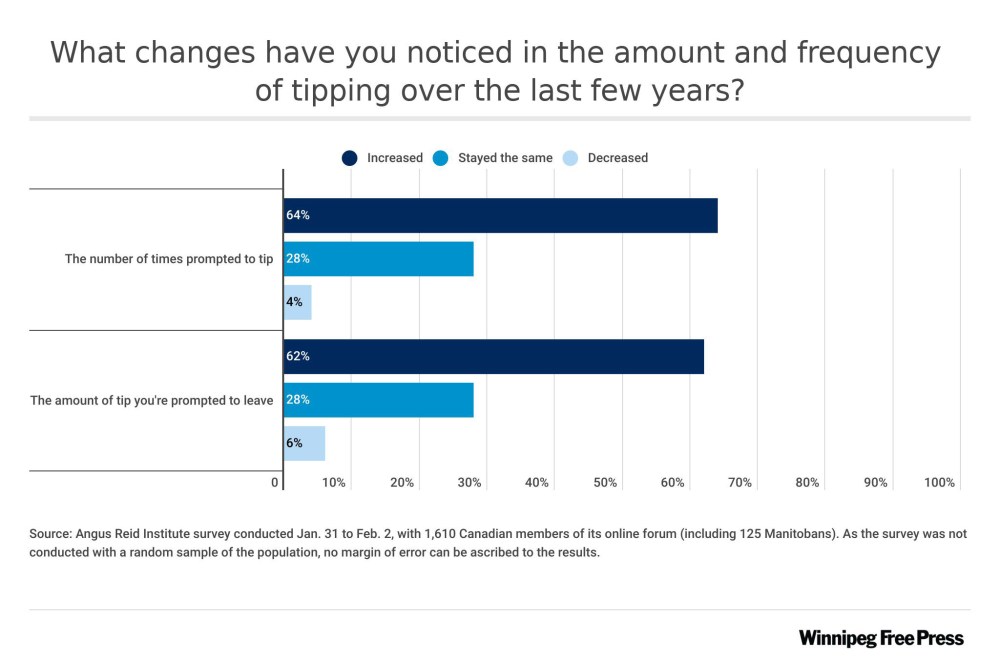 The sentiment comes as 62 per cent of Canadians — including 63 per cent of Manitobans — report being asked to tip more money at the end of a transaction.