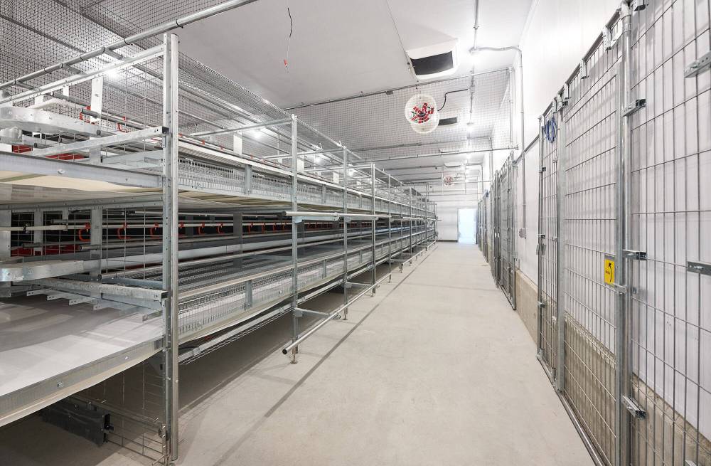 Free run aviary housing provides a multi-tiered system of enrichments for the hens, where they are able to perch, scratch and lay their eggs in nesting boxes.