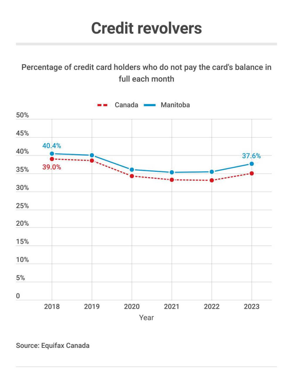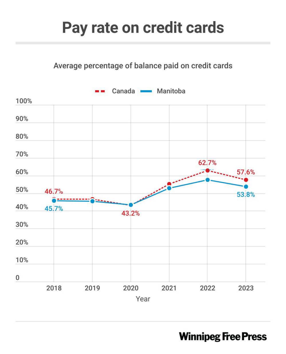 On average, Manitobans paid 53.8 per cent of their credit card balances in the spring, dropping from 57.5 per cent during the same season last year.