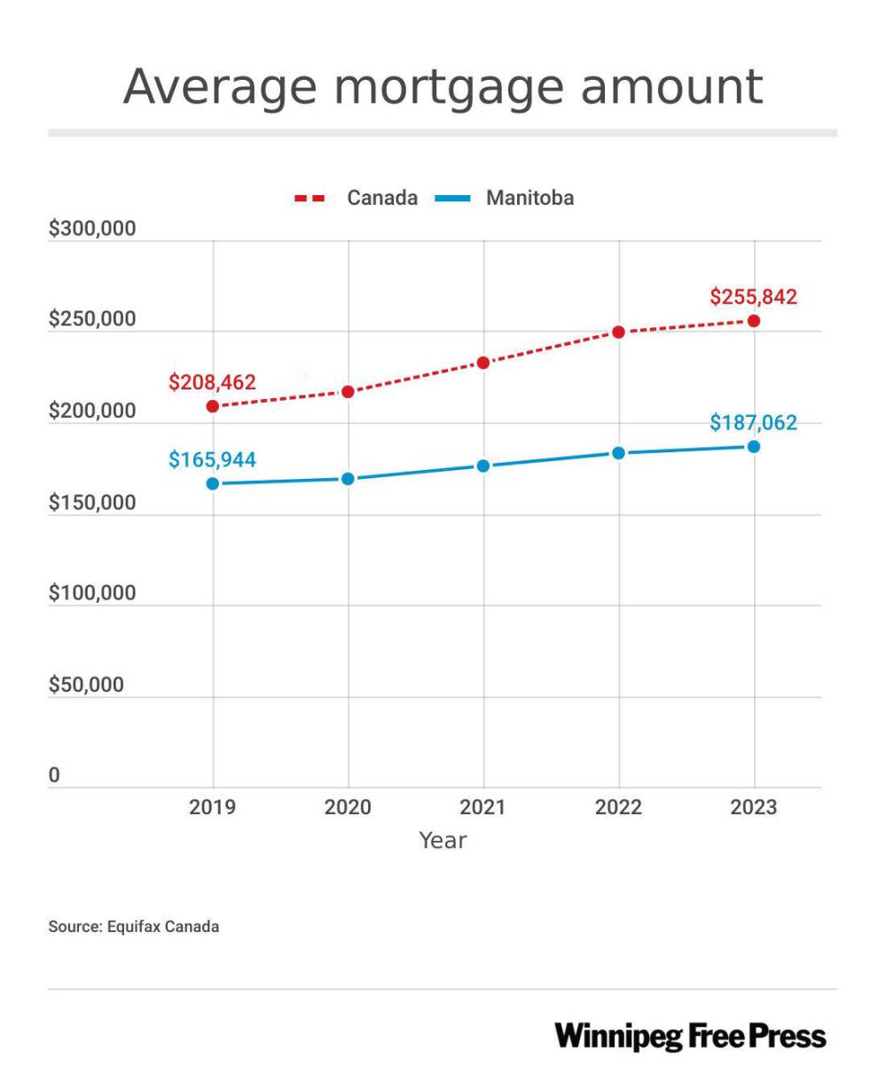 The average mortgage amount on a Manitoba home was $187,062 last spring, Equifax found, up from $165,944 four years earlier.