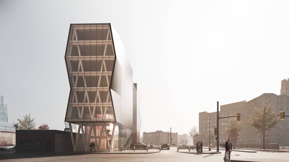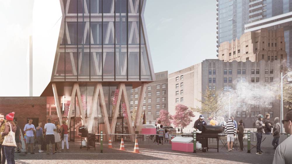 The Bond Redux is a development proposed by 5468796 Architecture for the Blue Cross Park area. It is designed to be built with mass timber, in a diagrid formation to keep the building from swaying with wind.