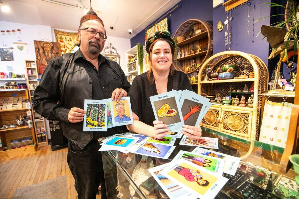 Grant and Aynsley Anderson, co-creators of savemichif.ca, show off some the Métis language learning project’s physical flash cards at Prairie Sky Books in Winnipeg.