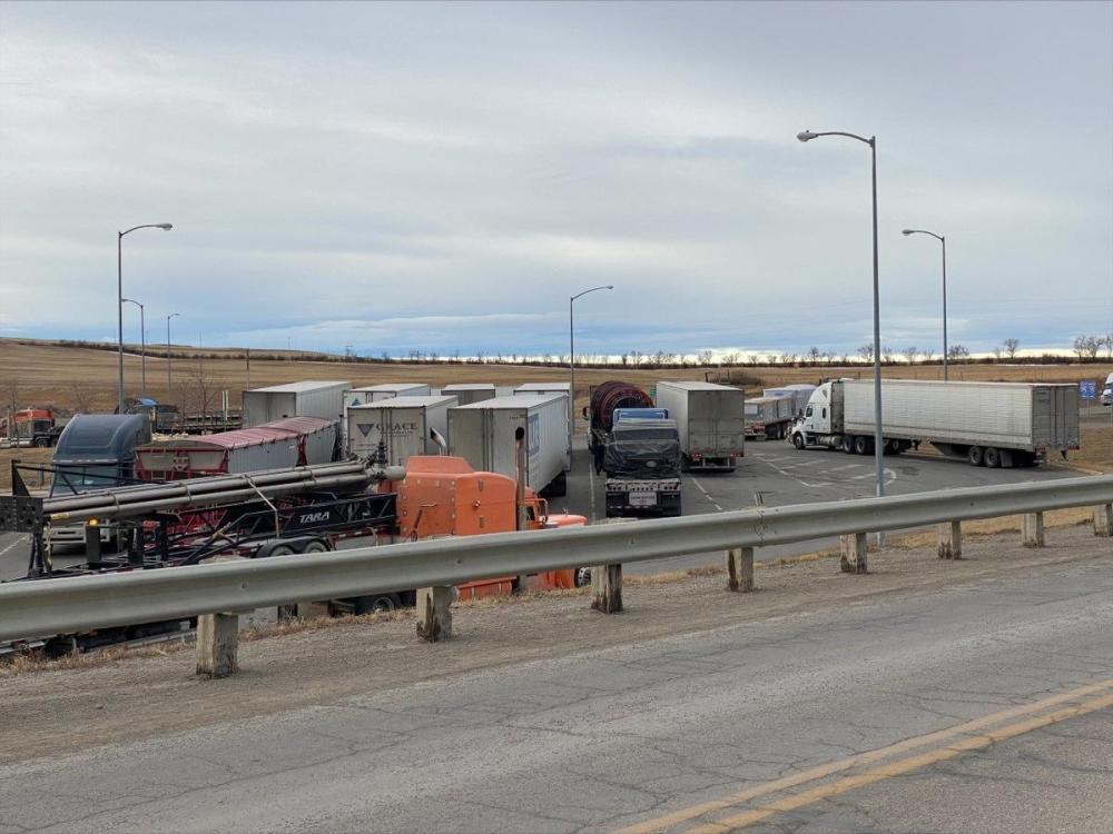 Rigs wait out the blockade in Sweet Grass, Montana.