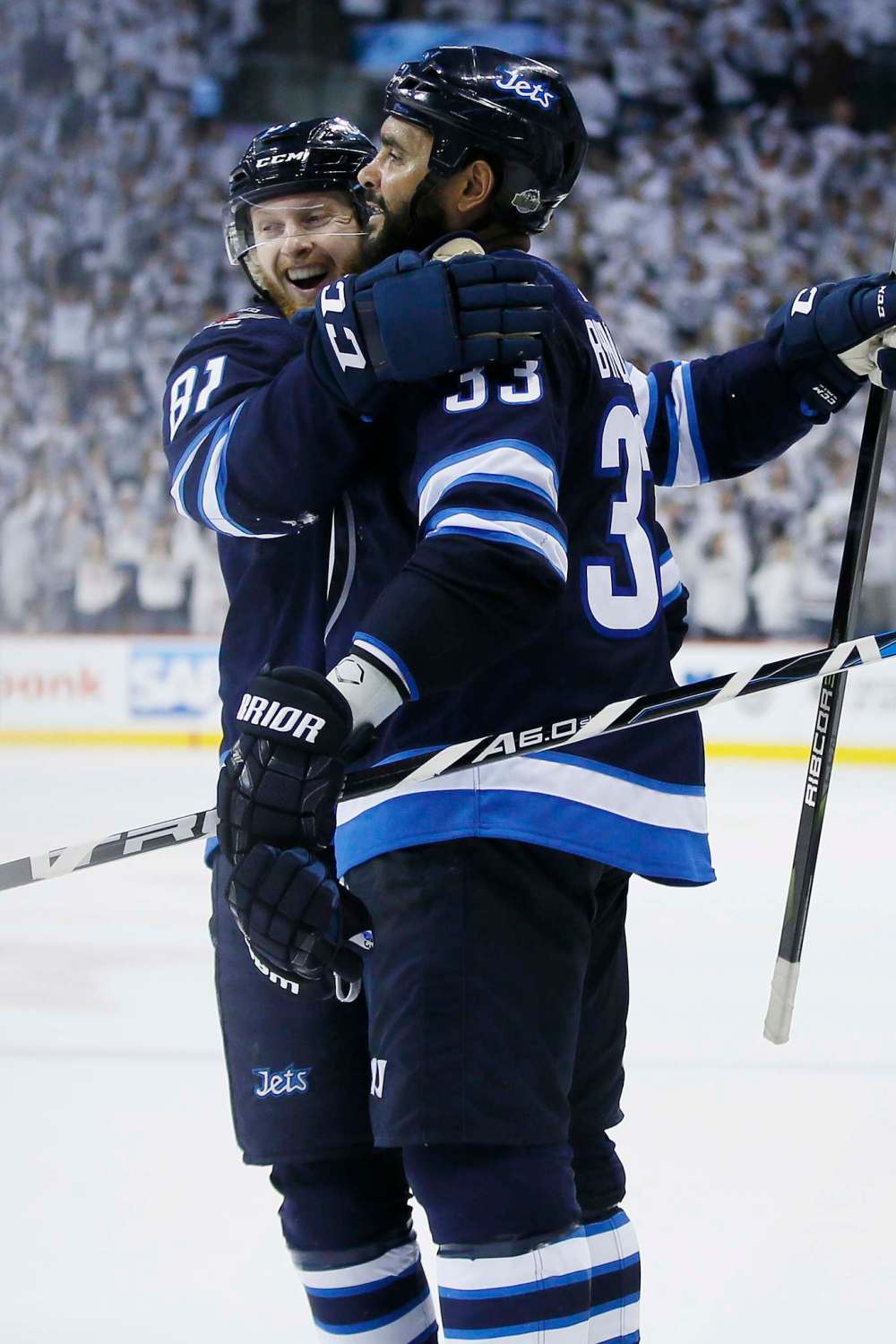Winnipeg Jets Kyle Connor (left) and Byfuglien celebrate Byfuglien’s second goal of the game against the Predators on Tuesday night.John Woods/Winnipeg Free Press