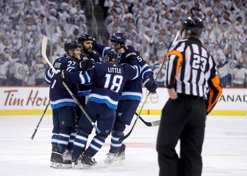 The Winnipeg Jets celebrate after Dustin Byfuglien (33) scored against the Nashville Predators during second period NHL hockey playoff action in Winnipeg, Tuesday, May 1, 2018. THE CANADIAN PRESS/Trevor HaganCP