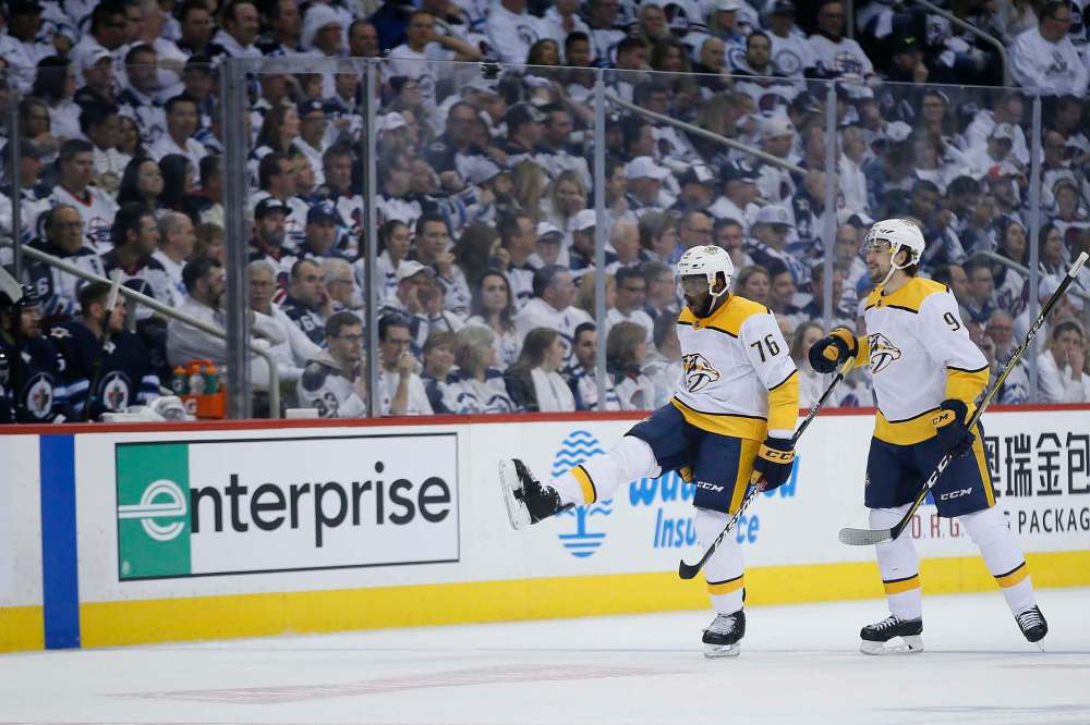 Nashville Predators' P.K. Subban (76) and Filip Forsberg (9) celebrate Subban's goal against the Winnipeg Jets during first period NHL round two game three playoff action in Winnipeg, Tuesday, May 1, 2018.Nashville Predators' Austin Watson (51) celebrates in front of the Jets bench after scoring during first period NHL hockey action in Winnipeg, Tuesday May 1, 2018. THE CANADIAN PRESS/Trevor HaganJohn Woods/Winnipeg Free Press