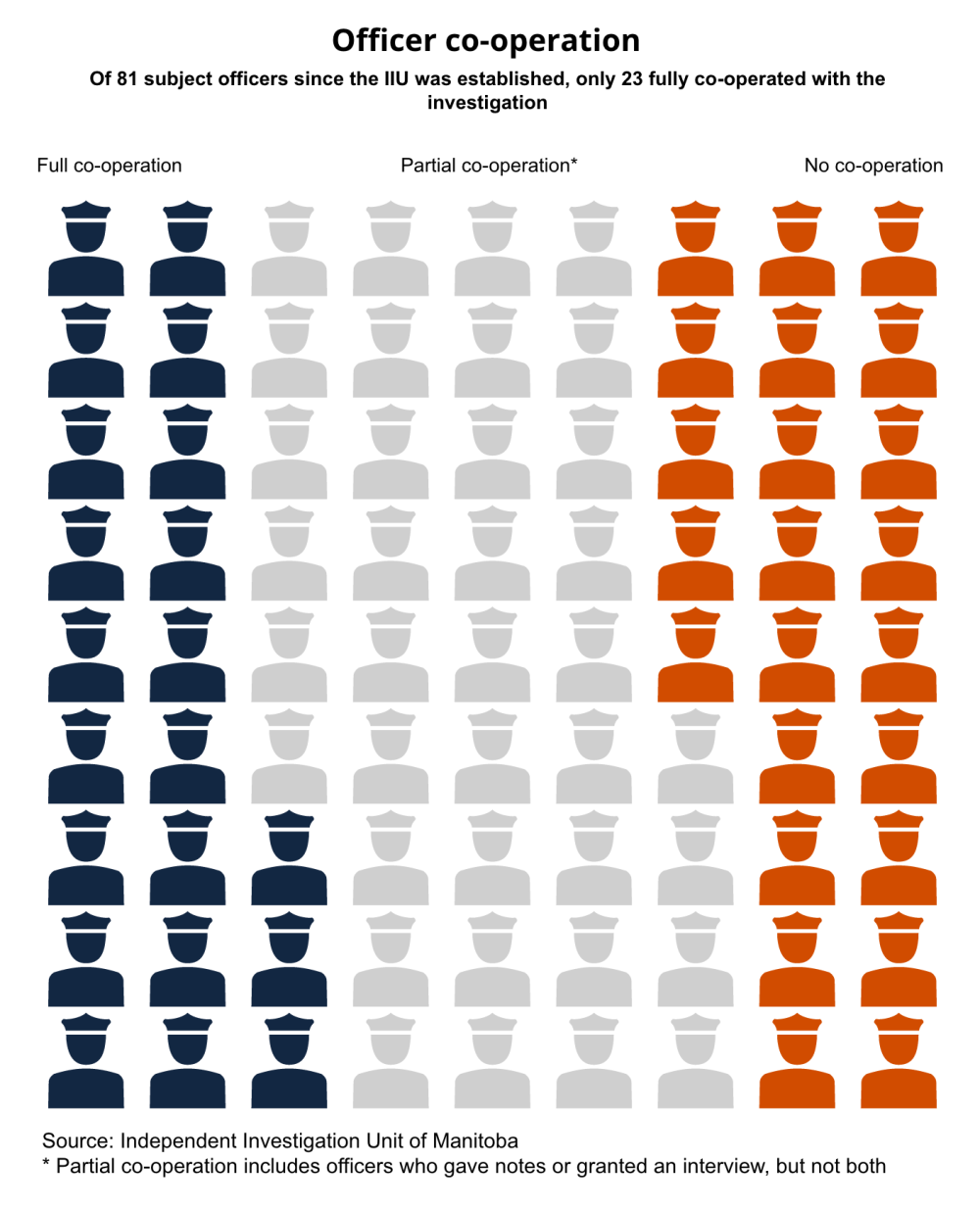In total, eight Manitoba police officers have been charged in seven IIU investigations. The small number of charges needs to be contextualized within the level of co-operation the IIU has received.