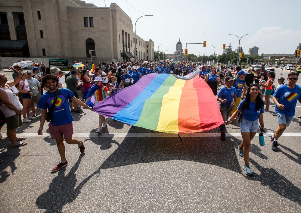 Thousands wearing rainbow colours flocked to the Manitoba Legislative Building grounds and Memorial Park in downtown Winnipeg for this year’s LBGTTQ+ Pride parade, happy to celebrate despite the sweltering heat.