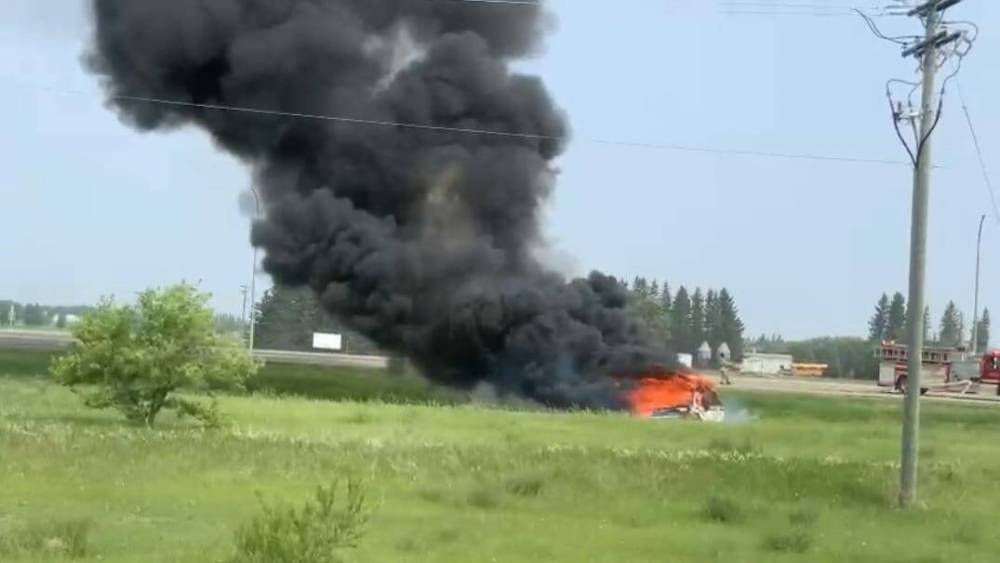 The bus, in a ditch, burned after the crash. (Skilled Truckers Canada / Facebook)