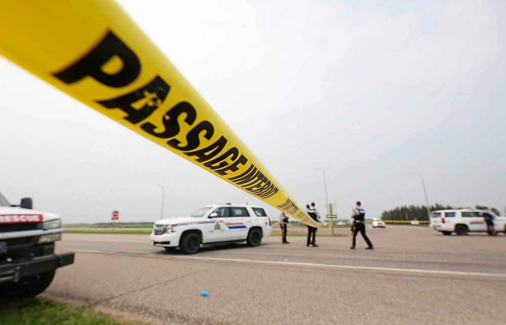 Police tape at the scene of a deadly collision between a semi truck and a small bus carrying seniors at the corner of Highway 5 and the Trans-Canada Highway near Carberry, Man. on June 15, 2023. (Matt Goerzen / The Brandon Sun)