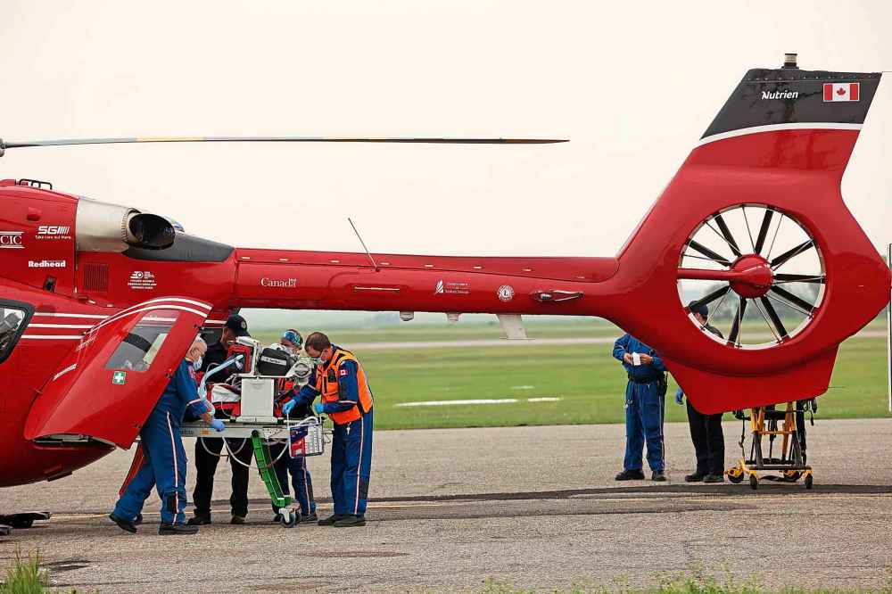 A critical care team loads a victim of the Trans Canada Highway mass casualty collision at Carberry into a STARS Air Ambulance for transport to the Health Sciences Centre in Winnipeg. (Tim Smith / The Brandon Sun)