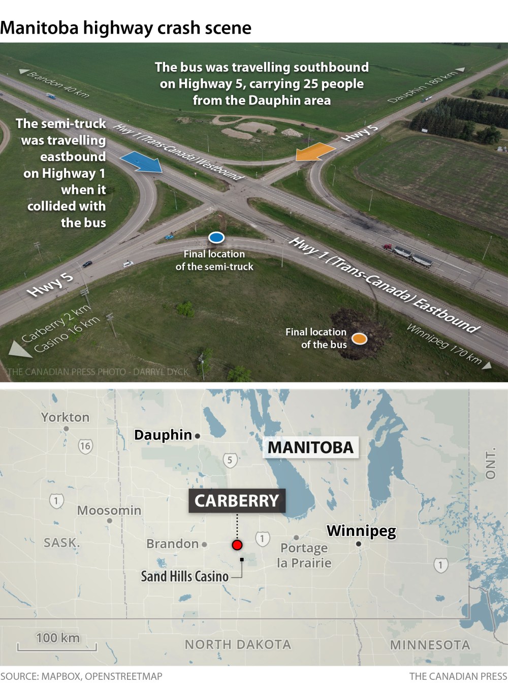 The seniors, who were from Dauphin and the surrounding area, were on a bus trip to Sand Hills Casino, 170 kilometres west of Winnipeg, when it collided with a semi-trailer just before noon Thursday.